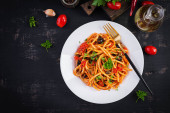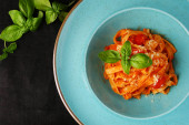 makaron marinara na drewnianym stole. Makaron z sosem marinara i świeża Bazylia na tle drewna
