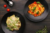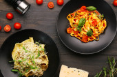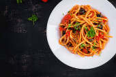 Zdjęcie "makaron marinara na drewnianym stole. Makaron z sosem marinara i świeża Bazylia na tle drewna" może być wykorzystywane do celów osobistych i komercyjnych zgodnie z warunkami zakupionej licencji Royalty-free. Obraz jest dostępny do pobrania w jakości wysokiej rozdzielczości do 5760x3840.