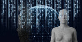 Skład ludzkiego biustu utworzonego z szarych cząstek nad przetwarzaniem kodu binarnego. globalna technologia, przetwarzanie danych i koncepcja połączeń generowanych cyfrowo.