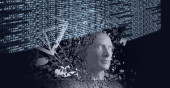 Kompozycja wybuchającego ludzkiego biustu utworzonego z białych cząstek i kodu binarnego. globalna koncepcja nauki, technologii i przetwarzania danych generowana cyfrowo.