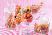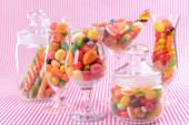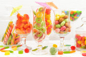 różnych kolorowych owocowych cukierków w okularach na stole na jasnym tle