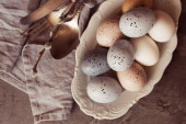 Zdjęcie "Vintage tło z pisanki w drewnianej płycie na betonowym tle. Serwetki i gałązki sprężynowe. Widok z góry z miejsca kopiowania." może być wykorzystywane do celów osobistych i komercyjnych zgodnie z warunkami zakupionej licencji Royalty-free. Obraz jest dostępny do pobrania w jakości wysokiej rozdzielczości do 5760x3840.