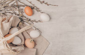 Vintage tło z pisanki w drewnianej płycie na betonowym tle. Serwetki i gałązki sprężynowe. Widok z góry z miejsca kopiowania.