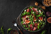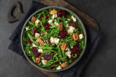 Zdjęcie "Arugula, sałatka z buraków i niebieskiego sera z orzechami orzechowymi w talerzu z widelcem na czarnym tle stołu. widok z góry z miejsca kopiowania. zdrowa wegetariańska żywność" może być wykorzystywane do celów osobistych i komercyjnych zgodnie z warunkami zakupionej licencji Royalty-free. Obraz jest dostępny do pobrania w jakości wysokiej rozdzielczości do 5760x3840.