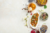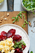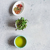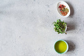 Zdjęcie "Świeże drobnozielone rzodkiewki w misce z oliwą z oliwek i pieprzem wymieszać na szarym tle szary tło. Zdrowy styl życia, Wegańskie jedzenie. Rosnące kiełki. Sos sałatkowy." może być wykorzystywane do celów osobistych i komercyjnych zgodnie z warunkami zakupionej licencji Royalty-free. Obraz jest dostępny do pobrania w jakości wysokiej rozdzielczości do 5760x3840.