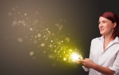 szczęśliwy ładna kobieta trzyma karty z śmieszne buźki