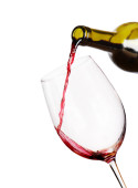 Młoda kobieta trzyma kieliszek czerwonego wina na białym tle. Ręka z czarnym lakierem.