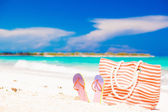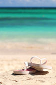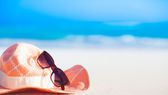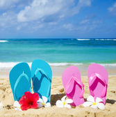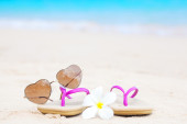 klapki japonki, okulary w kształcie serca i frangipani na tropikalnej plaży