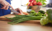 częściowy widok młodej dorosłej kobiety krojącej pomidory wiśniowe na desce do krojenia w nowoczesnej kuchni