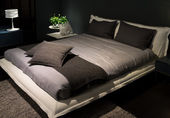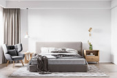 Big and comfortable bed in stylish and dark bedroom with gray walls, curtains and nice lighting