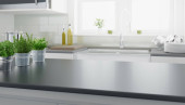 Close-up on black, granite kitchen countertop with decorative, white butter dish, stylish black and white salt and pepper shakers, mortar and fresh, green herbs in flower pots