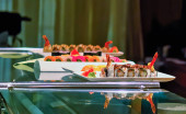 Zamknij pyszne ciasta deserowe w hotelu. Świeże kolorowe desery jagodowe, pięknie urządzone w Egipcie