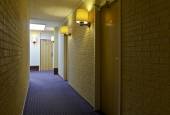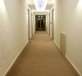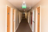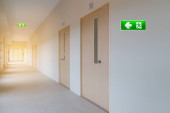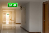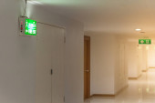 zielony znak wyjścia awaryjnego w hotelu wskazujący drogę do escap