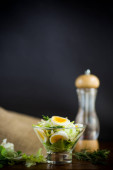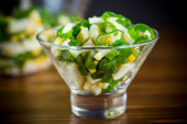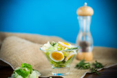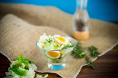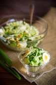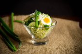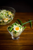 świeżej sałatki wiosennej z gotowaną kałamarnicą, jajkami i zieloną cebulą na drewnianym stole