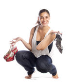 Elegancka kobieta trzyma buty na wysokich obcasach
