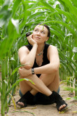 Szczęśliwa młoda kobieta w polu zielonym uszy, z efektem retro
