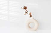 Branch of fluffy cotton flowers in white vase on stone surface. Interior floral composition.