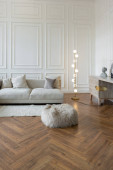 Zdjęcie "Nowoczesny salon z parkietem i stylowymi meblami. Miejsce na tekst" może być wykorzystywane do celów osobistych i komercyjnych zgodnie z warunkami zakupionej licencji Royalty-free. Obraz jest dostępny do pobrania w jakości wysokiej rozdzielczości do 5760x3840.