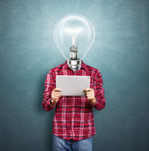 mężczyzna z lampy głowy w kolorze niebieskim, z otwartym laptopem w ręce