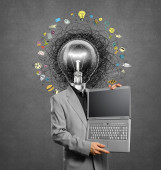 Zdjęcie "mężczyzna z lampy głowy w kolorze niebieskim, z otwartym laptopem w ręce" może być wykorzystywane do celów osobistych i komercyjnych zgodnie z warunkami zakupionej licencji Royalty-free. Obraz jest dostępny do pobrania w jakości wysokiej rozdzielczości do 5760x3840.