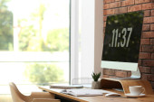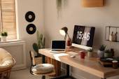 Zdjęcie "Nowoczesny komputer i laptop na drewnianym biurku w pokoju. Projekt wnętrza" może być wykorzystywane do celów osobistych i komercyjnych zgodnie z warunkami zakupionej licencji Royalty-free. Obraz jest dostępny do pobrania w jakości wysokiej rozdzielczości do 5760x3840.