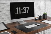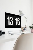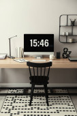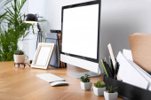 Nowoczesny komputer i laptop na drewnianym biurku w pokoju. Projekt wnętrza