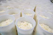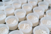 Containers with putty on the shelf in the factory shop