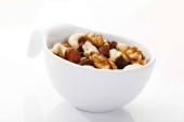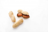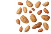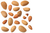 Almonds nuts, elevated view isolated on whitebackground