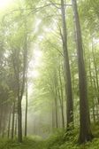 Szlak w mglisty jesień las na granicy drzew iglastych i liściastych.