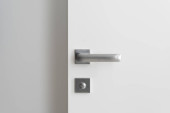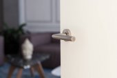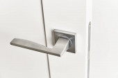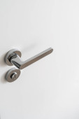 Zbliżenie minimalistycznej klamki stalowej w matowym kolorze jasnoszarym z blokadą bezpieczeństwa na zamkniętych białych drzwiach i włącznikiem światła na białej ścianie w pokoju hotelowym, ujęcie pionowe