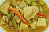 pikantne gotowane plasterki świeżego bambusa pędu i bakłażan z kurczaka w zupie curry mleka kokosowego na misce