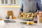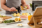 Mężczyzna robi kolację podczas oglądania online gotowania kurs przez laptop kuchnia, zbliżenie