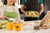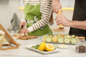 Zdjęcie "Mężczyzna robi kolację podczas oglądania online gotowania kurs przez laptop kuchnia, zbliżenie" może być wykorzystywane do celów osobistych i komercyjnych zgodnie z warunkami zakupionej licencji Royalty-free. Obraz jest dostępny do pobrania w jakości wysokiej rozdzielczości do 5760x3840.