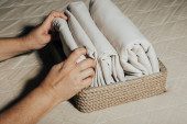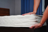 kobieta kładzie pościel lub podkładkę pod materac na łóżku
