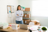 Mój biznes modowy szybko się rozwija. Latynoska właścicielka firmy czuje się dumna ze swojego sklepu odzieżowego
