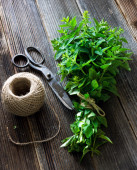 Świeża pietruszka jako koncepcja gotowania. Zielone zioła, stary drewniany stół. Nowoczesne twarde światło, ciemny cień, miejsce na tekst