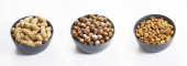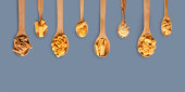 Orzeszki ziemne i masło orzechowe w drewnianej łyżce bambusowej na beżowym tle