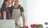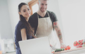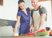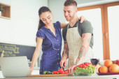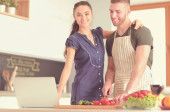 Młody mężczyzna kroi warzywa i kobieta stojąc z laptopem w kuchni