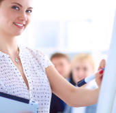 Uśmiechnięta kobieta z dokumentami siedzącymi na biurku z laptopem.