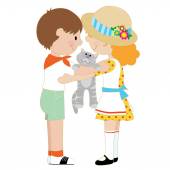 Ścisła siostra prowadzi młodszego brata za rękę. Cute postać kreskówki izolowane na białym tle. Kot jest w ramionach dziewczyny, chłopak patrzy w bok z otwartymi ustami.