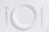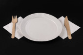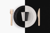 Białe danie papierowe, kubek papieru, drewniany widelec i nóż na białej serwetce na szarym tle, widok perspektywiczny. Zestaw ekologicznych jednorazowych zastaw stołowych z naturalnego materiału.