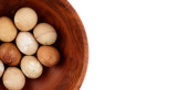 Colored easter eggs on white background with copy space. Rolling of easter eggs.