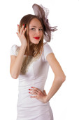 portret młodej kobiety atrakcyjne, gorset, rękawice i mały kapelusz na białym tle