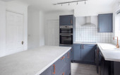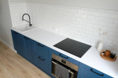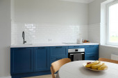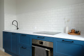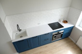 Zdjęcie "Scandinvain stylu niebieskie meble kuchenne. Nordic mała kuchnia wystrój wnętrz" może być wykorzystywane do celów osobistych i komercyjnych zgodnie z warunkami zakupionej licencji Royalty-free. Obraz jest dostępny do pobrania w jakości wysokiej rozdzielczości do 5760x3840.