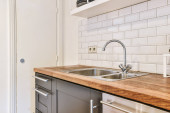 Zdjęcie "Nowoczesne wnętrza kuchni. Nordic stylu niebieskie szafki i biały blat widok z góry." może być wykorzystywane do celów osobistych i komercyjnych zgodnie z warunkami zakupionej licencji Royalty-free. Obraz jest dostępny do pobrania w jakości wysokiej rozdzielczości do 5760x3840.