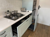 Nowoczesne wnętrza kuchni. Nordic stylu niebieskie szafki i biały blat widok z góry.