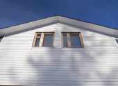 Plastikowa krata wentylacyjna na elewacji budynku z czarnego polistyrenu izolacyjnego, umieszczona pod kratownicą dachową.