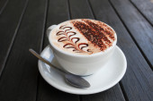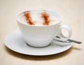 filiżankę cappuccino z śmietaną i gałką muszkatołową