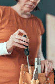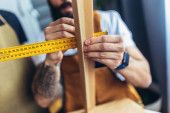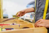 Zamazany projektant mierzący wzór szycia na wieszaku w pracowni