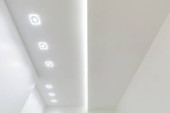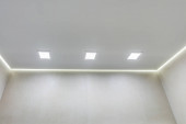 sufit podwieszany z lampami halogenowymi i konstrukcją płyt gipsowo-kartonowych w pustym pomieszczeniu w mieszkaniu lub domu. Sufit napinany biały i skomplikowany kształt.